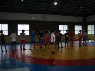 試合観戦をする大勢の先輩達とレスリング部長の坂上教授。試合は主に現役同士で、林VS堀井、綿谷VS宮川、宮原VS中西、笠原VS古川、中村VS松本、崎原VS奥井で、全部左側が勝ちました。